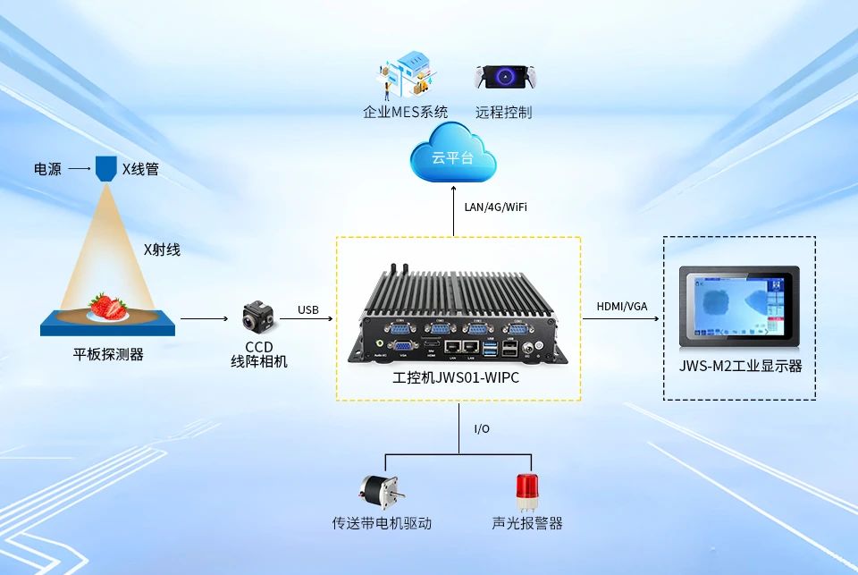 Jawest Solutions應(yīng)客戶需求,佳維視提供”JWS01-WIPC工控機(jī)+JWS-M2嵌入式工業(yè)顯示器”解決方案,組成X-Ray異物檢測(cè)機(jī)的智能控制系統(tǒng),提升食品檢測(cè)效率和精度。