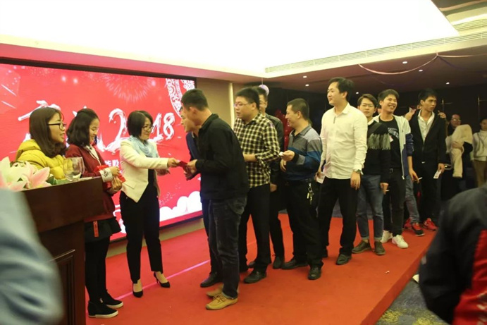 晚會前,主持人先行福利!一波現金紅包抽獎預熱,率先點嗨全場氣氛!由常務副總方少林先生親自抽出五位現場三等獎幸運兒。鴻運當頭喜獲紅包,這五位幸運兒想必今年也會財運連連~中獎的同事在領獎后,發表了新的一年,自己對公司祝福與期待。