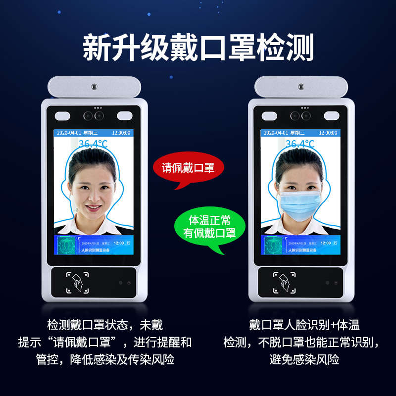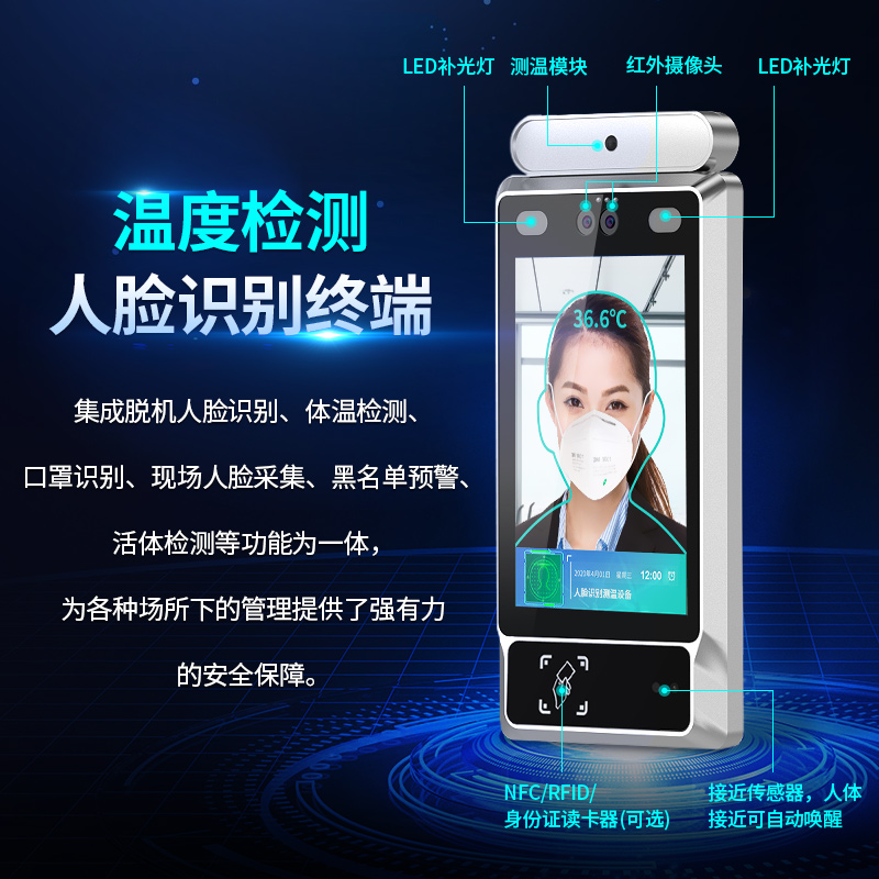 自主研發(fā)工業(yè)級安卓RK3288芯片板載,時間7*24小時無間斷穩(wěn)定服務,拓展雙目200W寬動態(tài)攝像頭,能快速采集識別出入人員信息,提供場所安全性和通行效率。集非接觸式體表溫度檢測+活體檢測于一體,快速篩查,提前預警;體表測溫誤精度±0.3℃;支持口罩檢測;支持戴口罩人臉識別;檢測體溫異常后現(xiàn)場輸出語音報警;人臉識別+體溫檢測+口罩識別,多種組合配置;深度人臉識別算法,穩(wěn)定可靠;尺寸屏幕,屏幕占空比;鋁合金金屬外殼,質量保證;支持脫機工作模式;支持HTTP協(xié)議,快速開發(fā)和集成,可向其他健康管理平臺提供數(shù)據(jù)接口,實現(xiàn)健康大數(shù)據(jù)聯(lián)動;